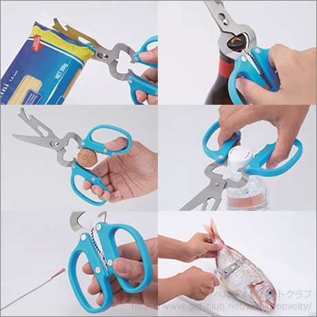 はさみ、栓抜き、くるみ割り、キャップオープナー、ケーブルストリッパー、ウロコ取り、