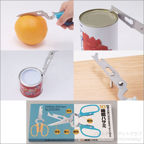 ナイフ、缶切り、缶オープナー、六角レンチの10通りの使い方ができます。