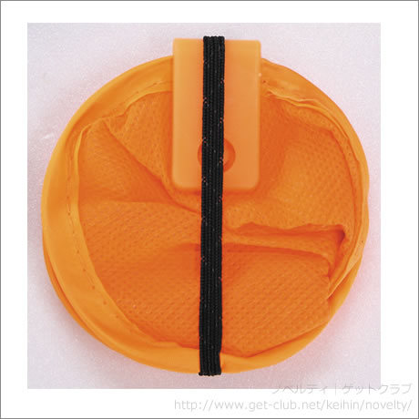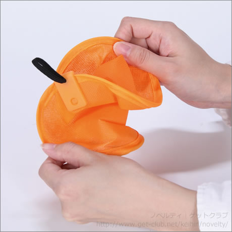 ひねって畳んでコンパクトになる、まとめゴム付の携帯うちわ。