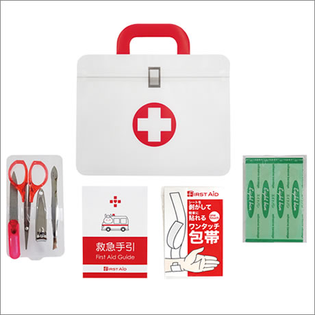 <セット内容>ジッパーポーチ・絆創膏5P・ワンタッチ包帯・爪切り・はさみ・毛抜き・爪やすり・救急手引×各1