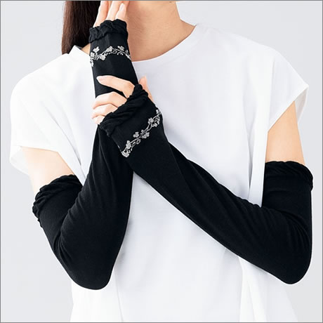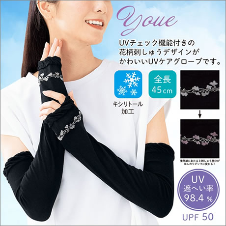 UVチェック機能付きの花柄刺しゅうデザインがかわいいUVケアグローブです。
