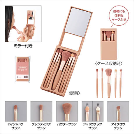 フルメイクをする日もこのブラシセット1つにおまかせ!ブラシ5本、さらにミラーも付いて外出先でも便利。