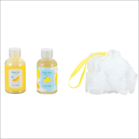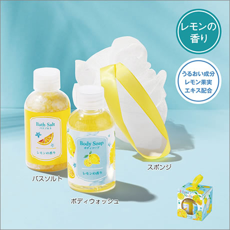 香りとうるおい成分が嬉しい、レモン果実エキスを配合。バスソルトとボディソープ、スポンジのボリュームセットです。