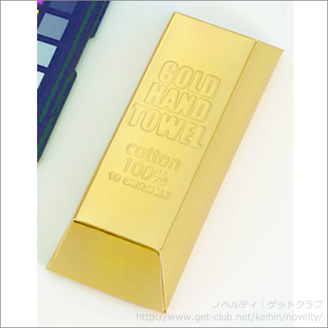 金の延べ棒パッケージ入りのハンドタオル。黄金色は幸運を呼ぶ色、積み上げてプチギフトにもおすすめ。
