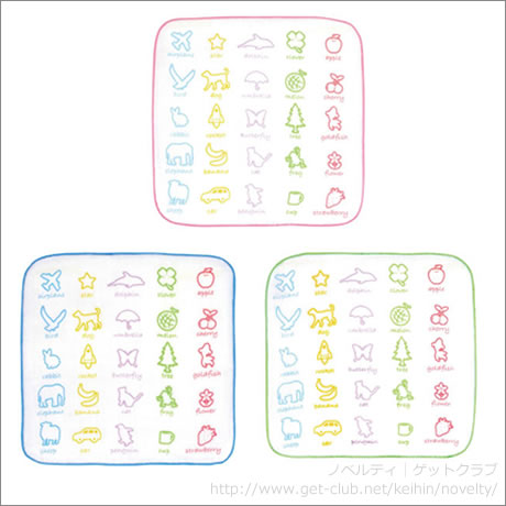 大人から子供まで使えるシンプルなデザインと英語の勉強にもなるイラストとアルファベット柄が特徴のガーゼ風ハンカチ