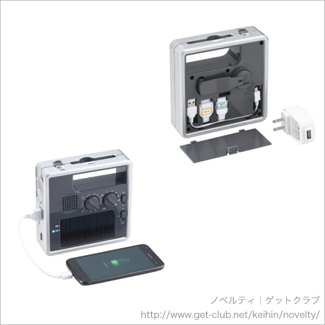 非常の場合に便利なダイナモ発電式の携帯電話充電器。電池、USB接続、ソーラー発電など5電源式です。ダイナモ発電、ソーラー充電、AC充電、AMFMラジオ、LEDライト、サイレン、携帯電話充電機能