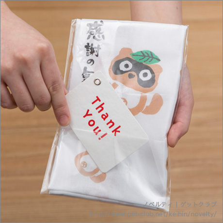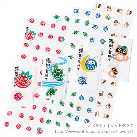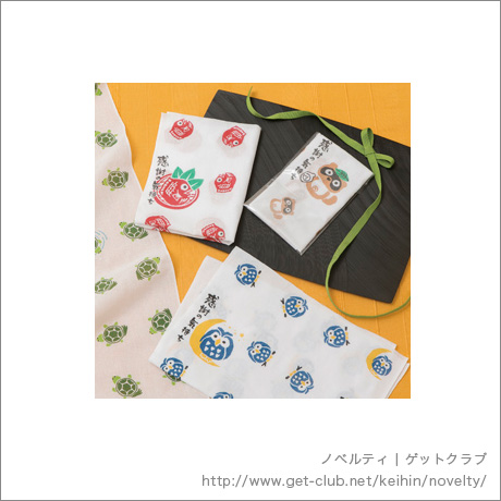 縁起物の柄と感謝のメッセージ入りの景品です。ポケット付でご挨拶用にぴったり。