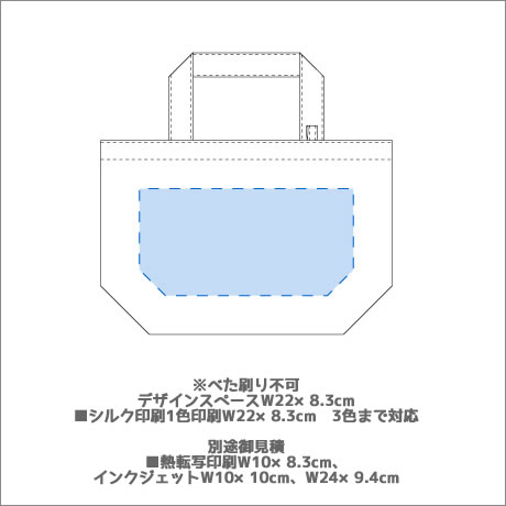 デザインスペースW22×8.3cm ■シルク印刷1色印刷W22×8.3cm 3色まで対応 別途御見積■熱転写印刷W10×8.3cm、インクジェットW10×10cm、W24×9.4cm OPP袋入れは別途@25円 |
