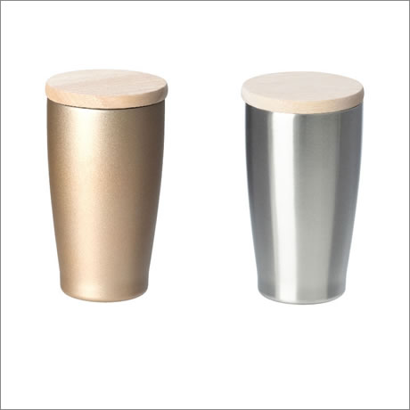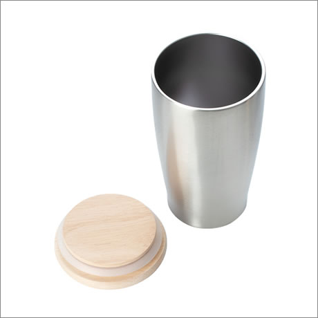 天然木の蓋が付いた、真空2重構造のステンレスタンブラー。