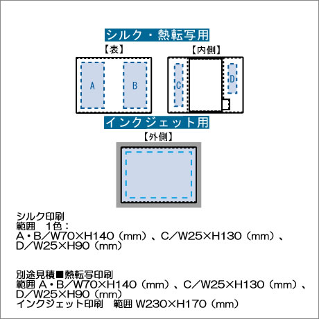 別途見積■熱転写印刷 範囲 A・B/W70×H140(mm)、C/W25×H130(mm)、D/W25×H90(mm)、 インクジェット印刷 範囲 W230×H170(mm) |