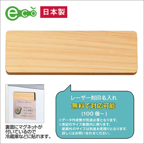 "国産間伐材ヒノキノベルティグッズ 裏面にマグネットが付いているので冷蔵庫などに貼れます。
