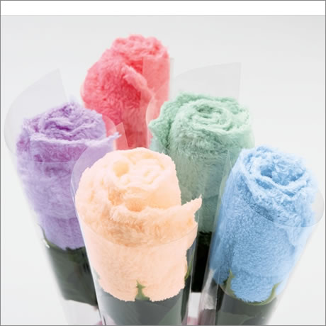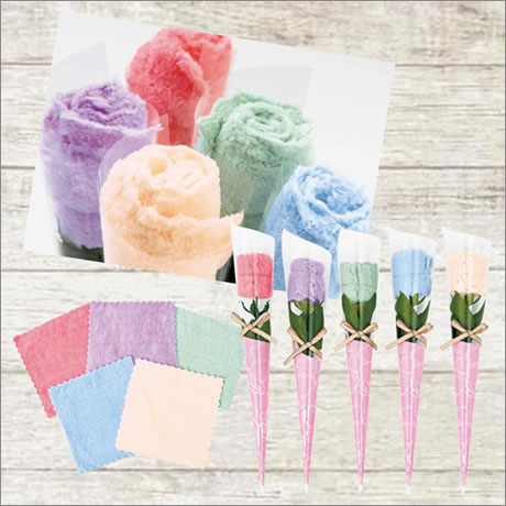 バラの花のようにラッピングしたふんわり柔らかなタオルハンカチです。