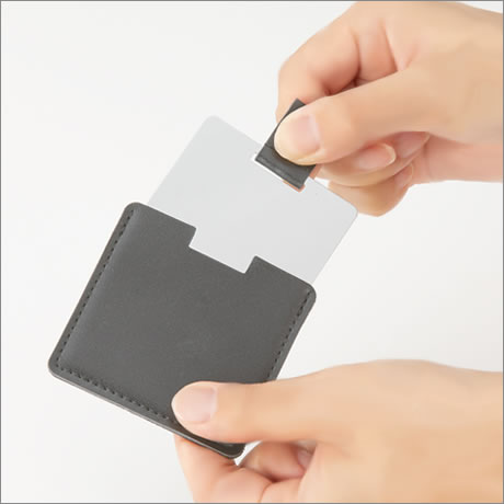 バッグの外ポケットや胸ポケットなどの小スペースに収納できる、携帯に便利なカード型ミラーです。
