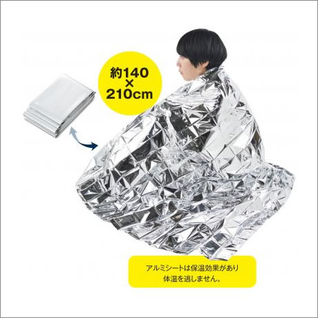 体に巻き付けると身体の熱を反射し、防水・防風性もあるので保温ができるアルミシートです。