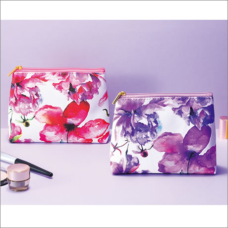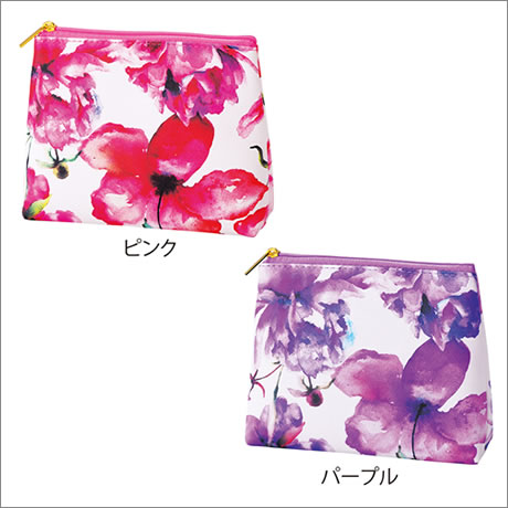 上品なサフィアーノ調生地に、水彩画タッチの大輪の花をプリントした、贅沢ポーチ。