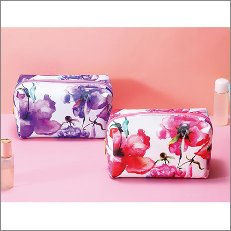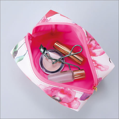 大胆な花柄プリントが目を引く、収納力抜群のボックス型ポーチです。