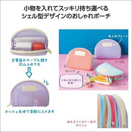 たっぷり入る使い勝手の良いシェル型ポーチです。