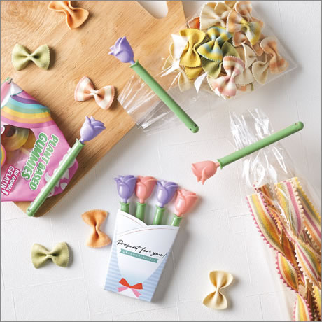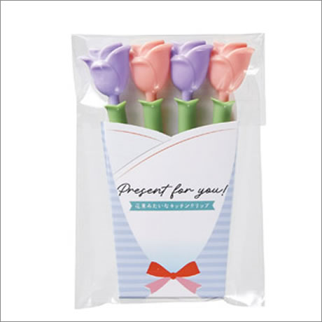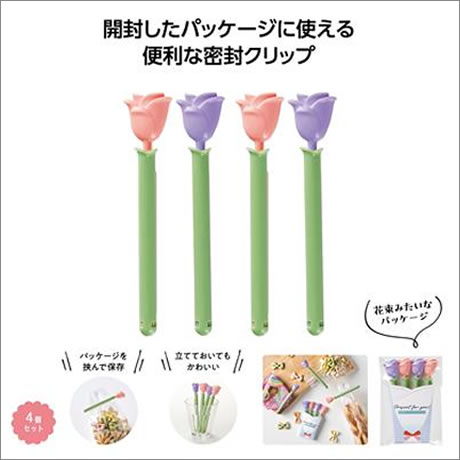 袋の口をかわいく彩る、お花の形をつけたクリップ 4本セットです。