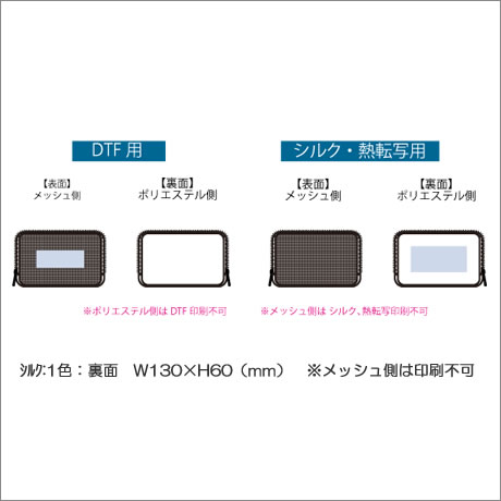 備考 シルク:1色:裏面 W130×H60(mm) ※メッシュ側は印刷不可