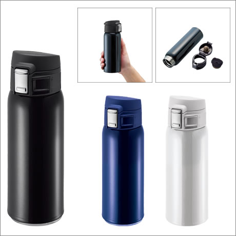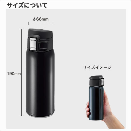 片手で簡単に開閉出来るワンタッチボトル。口元にフィットする小さめの飲み口で、口触りも良く飲みやすい仕様に。飲み口はロック機能付なのでバッグに収納しても安心です。真空2重構造なので、温度をしっかりキープ。分解もしやすく手入れもしやすい衛生的な構造もポイントです。名入れは回転シルク印刷でほぼ全周印刷が出来ます。ワンタッチ開閉タイプはスポーツ向けの他、車利用者にも好まれる形の為、物販品としてのご利用や、来場・成約記念品としてのご利用もおすすめです。サイズ違いで480mlもございます。