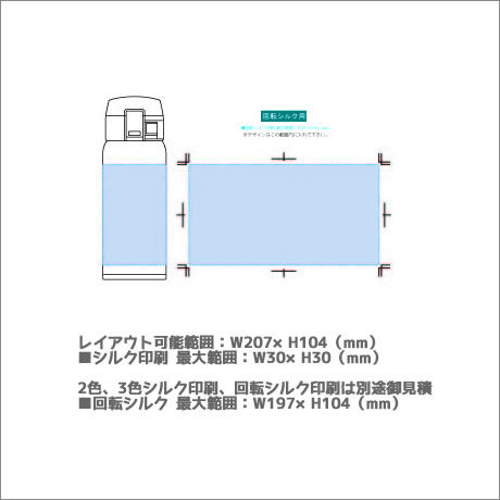 ■シルク印刷 最大範囲:W30×H30(mm) 2色、3色シルク印刷、回転シルク印刷は別途御見積 ■回転シルク 最大範囲:W197×H104(mm) |