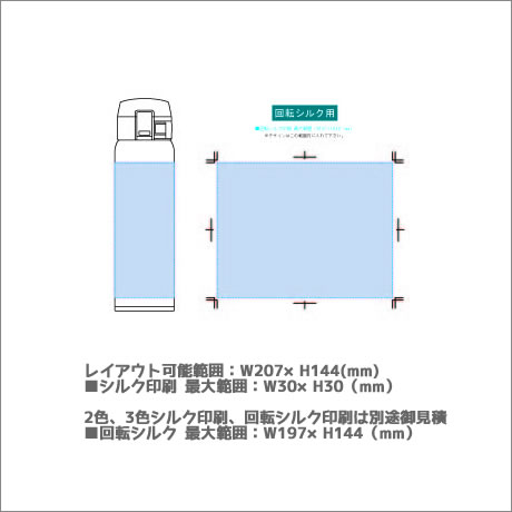 ■シルク印刷 最大範囲:W30×H30(mm) 2色、3色シルク印刷、回転シルク印刷は別途御見積 ■回転シルク 最大範囲:W197×H144(mm) |