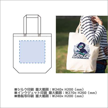 ■シルク印刷 最大範囲:W240×H200(mm) ※インクジェット印刷小と大で単価が変わります。別途御見積ご依頼ください ■インクジェット印刷 最大範囲:W270×H260(mm) ■熱転写印刷 最大範囲:W240×H200(mm) |