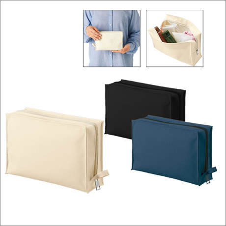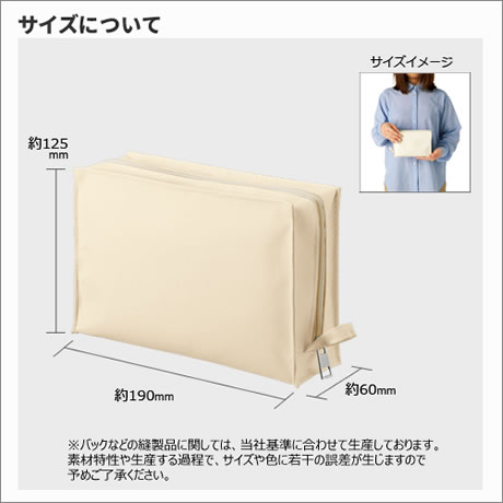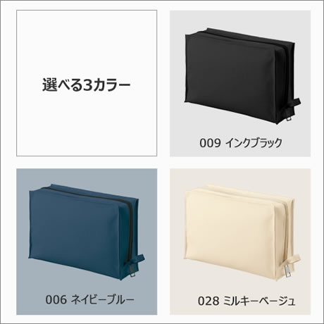 カラーは定番のミルキーベージュ、ブラック、ネイビーの3色展開、コスメポーチやトラベルポーチとして男女問わずお使い頂けます。