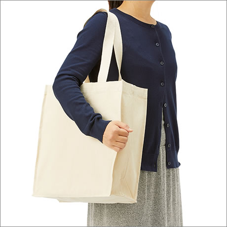 流行のスクエア型トート 綿テープのハンドルは肩掛けしやすい長さ。