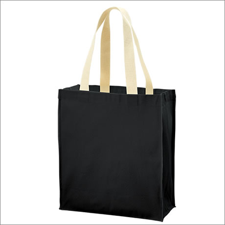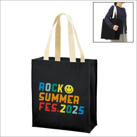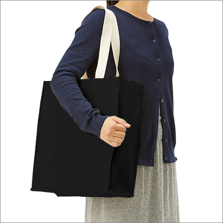 流行のスクエア型トート 綿テープのハンドルは肩掛けしやすい長さ。