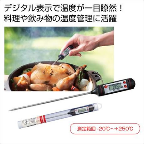 測定範囲 -20℃~+250℃差し込んで料理や飲み物等の温度が測定できます。肉料理や揚げ物など火の具材への火の通りが確認出来ない場合がございますがデジタル温度計を使えばお料理の適温管理が実施できます。また家庭内はもちろん野外での調理などにも活躍するアイテムです。