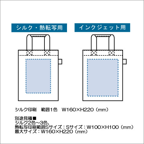 別途見積■シルク2色~3色、熱転写印刷範囲Sサイズ:Sサイズ:W100×H100(mm)最大サイズ:W160×H220(mm) |