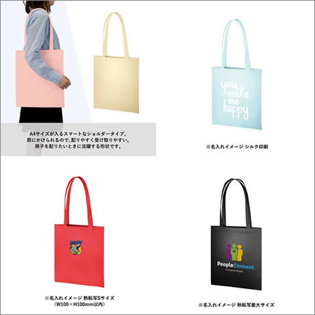 ちょっとした冊子を配りたいときに活躍するA4サイズが入るスマートなショルダータイプのトートバッグです。