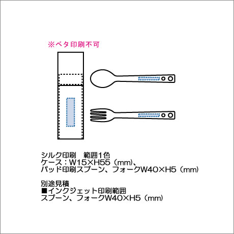 シルク印刷 範囲1色ケース:W15×H55(mm)、パッド印刷スプーン、フォークW40×H5(mm)