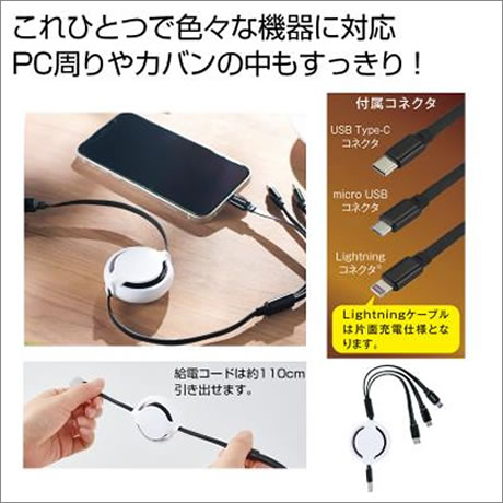 これ一つで様々な機器に対応。PC周りやカバンの中もスッキリ!