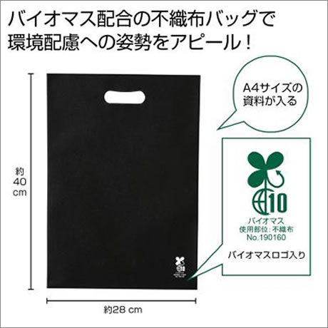 名入れして展示会や説明会、各種セミナーでの資料配布等で使用すれば、環境配慮の姿勢をアピールできます。右下にバイオマスマーク入り。 材質:バイオマス10%不織布(ポリプロピレン)