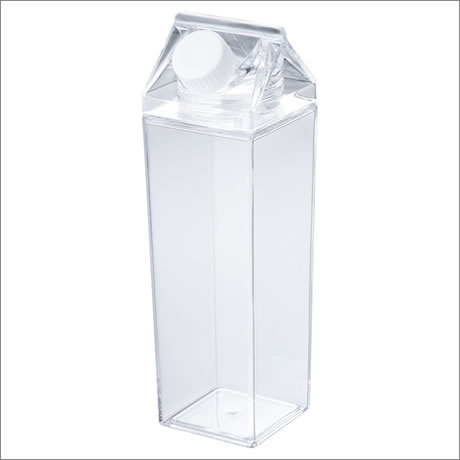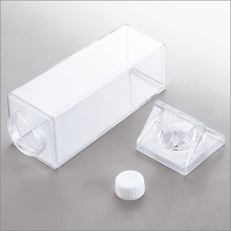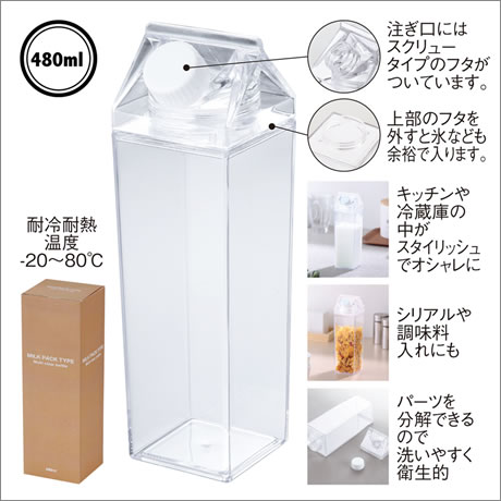 牛乳パックをモチーフにしたスタイリッシュなデザインのクリアボトル。