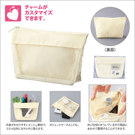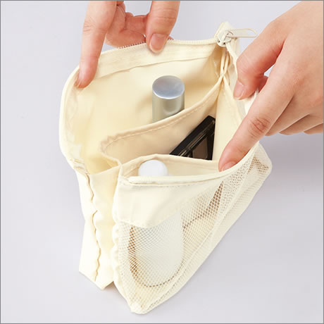 ポーチの中でごちゃつきがちな小物類が見映えよく収まる3室構造のスマートポーチ。
