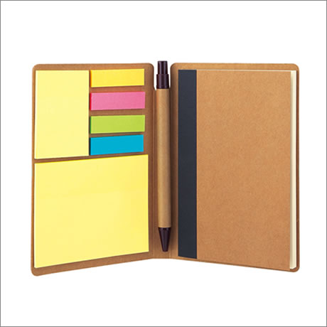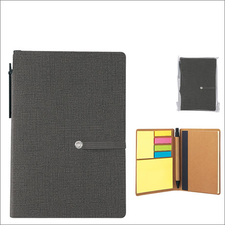 メモ書きに欠かせないノートと、大中小3種類のふせんとボールペンを高級感あるカバーにセットしました。