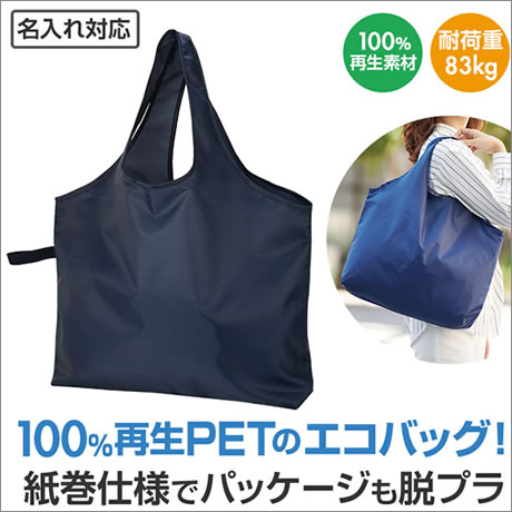 100%再生PET生地でつくったエコバッグです。パッケージも紙巻使用で、脱プラ・サステナブルを訴えられるアイテムです。