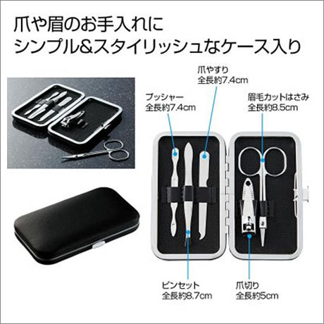 <セット内容>  ・プッシャー×1  ・ピンセット×1  ・爪やすり×1  ・爪切り×1  ・眉毛カットはさみ×1
