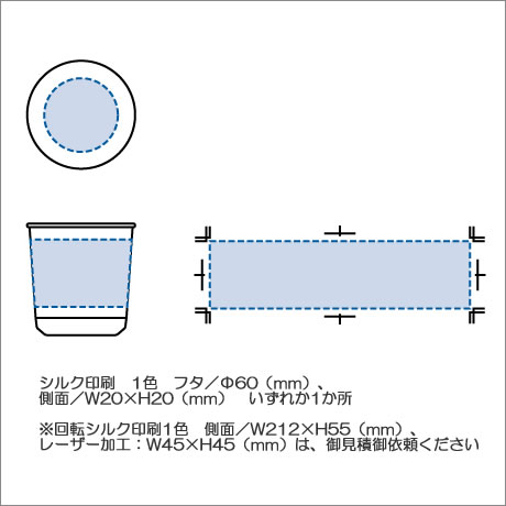 | 備考 | シルク印刷 1色 フタ/Φ60(mm)、側面/W20×H20(mm) いずれか1か所 ※回転シルク印刷1色 側面/W212×H55(mm)、レーザー加工:W45×H45(mm)は、御見積御依頼ください |