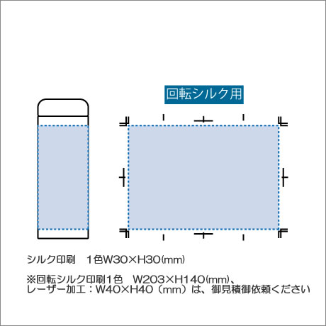 | 備考 | シルク印刷 1色W30×H30(mm) ※回転シルク印刷1色 W203×H140(mm)、レーザー加工:W40×H40(mm)は、御見積御依頼ください |