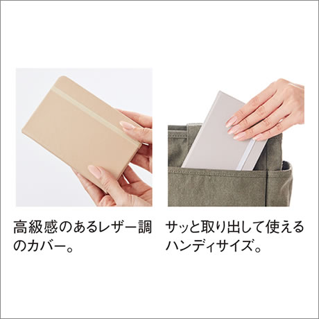 カバー部分には再生PU、紙は再生紙を使用したエコなレザー調ノート。