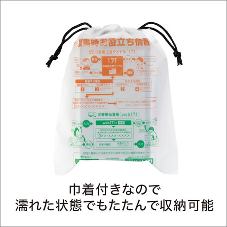 付属の巾着には役立つ情報をプリントしました