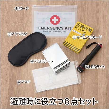セット内容:ポーチ×1・マニュアルカード×1・LEDライト×1・アルミシート×1・マスク×1・アイマスク×1