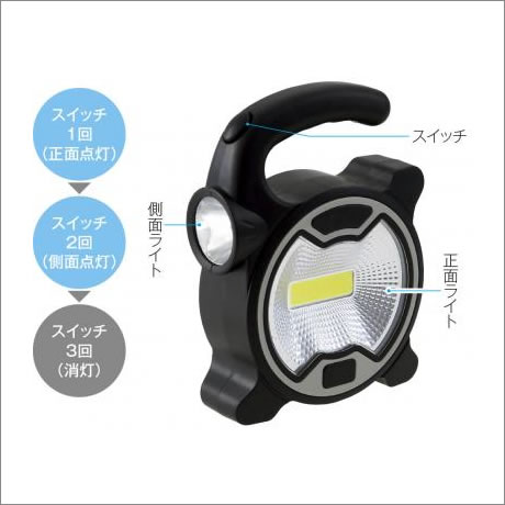 側面ライトでハンディタイプとして夜間の外出や作業に!正面ライトでワイドに照らして非常用に!
