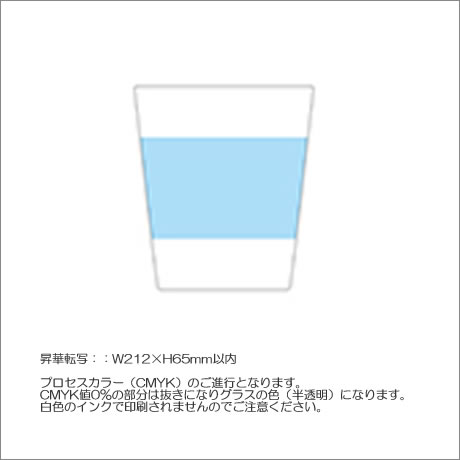 | 備考 | 昇華転写::W212×H65mm以内 プロセスカラー(CMYK)のご進行となります。 CMYK値0%の部分は抜きになりグラスの色(半透明)になります。 白色のインクで印刷されませんのでご注意ください。 |