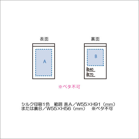 | 備考 | シルク印刷1色 範囲 表A/W55×H91(mm) または裏B/W55×H56(mm) ※ベタ不可 |