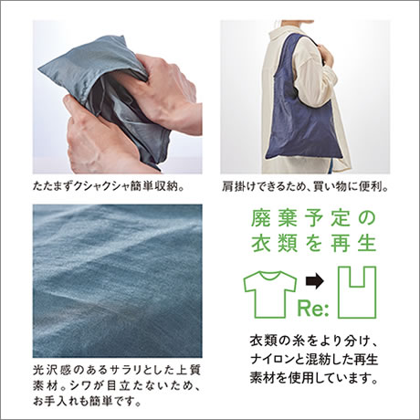廃棄予定の衣類を再利用した、上質な風合いのエコバッグ。